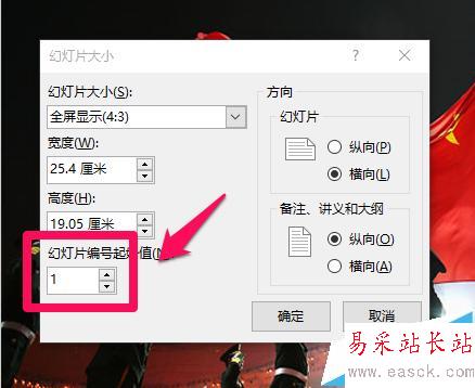 4、打開”幻燈片大小“對話框,在”幻燈片編號起始值“數值框中直接輸入起始編號”5“,也可以通過數值框右側的調節按鈕進行調節,然后單擊”確定“按鈕即可。