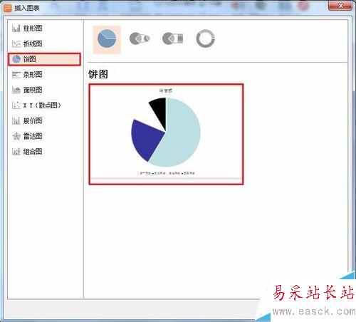 2、在插入圖表對(duì)話框中選擇餅圖,確定。