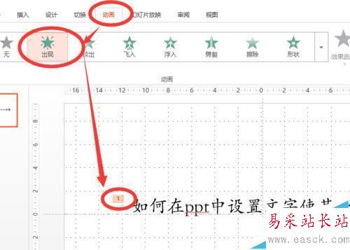 2、選中以后點擊上方工具欄中的的【動畫】,然后點擊動畫效果【出現】,這時選中的文字就會在左上角出現數字角標,這就意味著選中的文字已經有了基本的動畫。如圖所示。