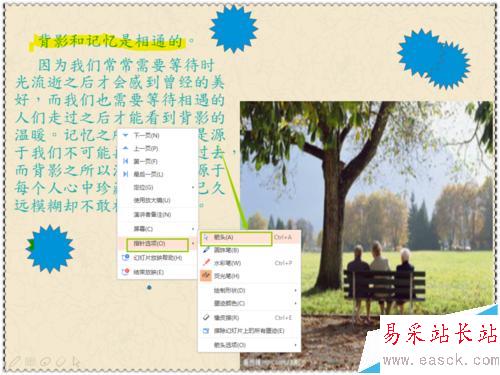 9、要回到普通的PPT播放模式。按鍵盤上的“esc”鍵,或是先右擊鼠標,選中“指針選項”,選定“箭頭“即可。