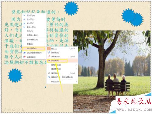 7、然后,先右擊鼠標,選中“指針選項”,選定“熒光筆”(水彩筆或圓珠筆)。