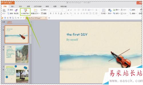3、然后點擊偏左上角的“從當前播放”,播放PPT。