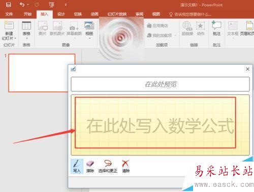 3、接下來會彈出一個公式輸入窗口,在黃色的部分即可按住鼠標左鍵進行手寫。