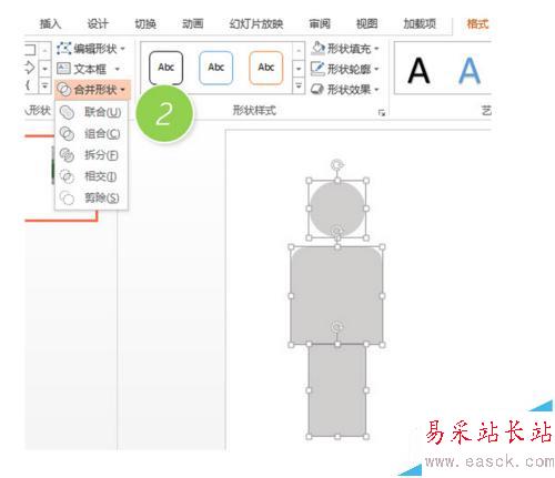 2、緊接著,全選三個(gè)圖形,然后去除他們的輪廓線,把顏色改成灰色,然后利用圖形“聯(lián)合”功能(下圖2處),將三個(gè)圖形變成一個(gè)人形圖形。