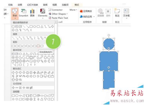 1、新建一個(gè)PPT頁面,在圖形中插入圓形、同側(cè)圓角矩形(下圖1處)和長(zhǎng)方形,然后組合出一個(gè)人形的圖形效果。注意圓形(頭)和長(zhǎng)方形(腿)的寬度一樣,同側(cè)圓角矩形略寬。注意人形之間的比例。