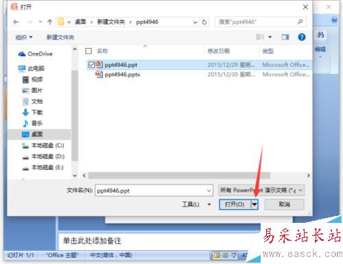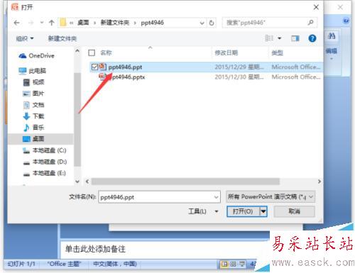3、接著在打開的對話框中,找到存放PPT幻燈片的目錄,將需要打開的PPT幻燈片文件選中。如圖所示;