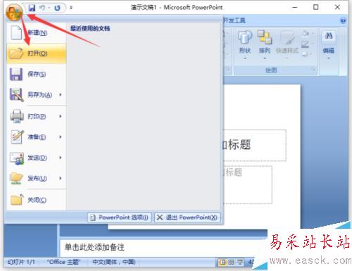 2、在打開的PowerPoint2007編輯窗口,點擊左上角的“Office”圖標。然后在點擊“打開”選項命令。如圖所示;