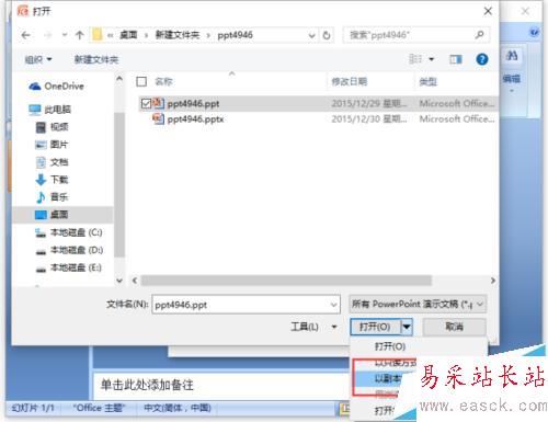5、點擊倒三角下拉按鈕圖標后,在彈出的菜單列表中選中“以副本方式打開(C)”選項并點擊它。如圖所示;