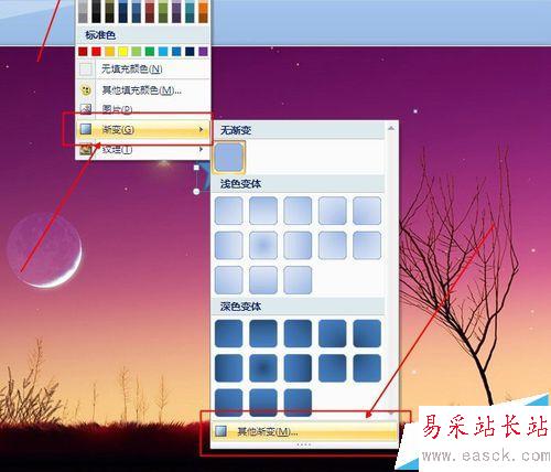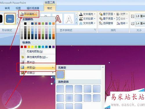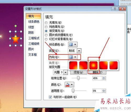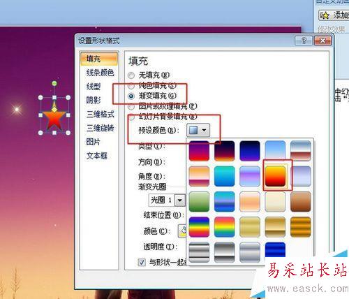 3、修改星星填空顏色。雙擊星星,選擇工具欄中的形狀填充,選擇漸變,選擇其它漸變,選擇紅色。為了效果更逼真,可以設置其它的選項,比如旋轉等等。