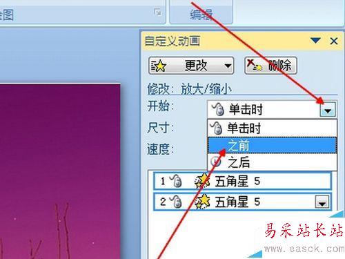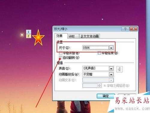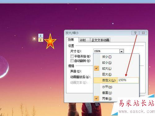 3、修改星星動畫。選擇動畫工具欄中第一個動畫,右面的箭頭,選擇效果選項,選擇尺寸,修改變化的幅度,可以設置不同的比例,以達到星星閃爍的效果。