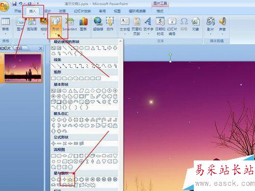 2、繪制星星。選擇插入菜單,選擇形狀,選擇星與旗幟中的星星圖片。這時,鼠標變成十字形狀,拖動,就可以畫一個星星。建議畫大一些,設置時查看效果明顯。