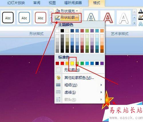 4、修改星星線條顏色。雙擊星星,選擇工具欄中的形狀輪廓,選擇黃色。