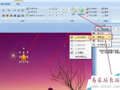 2、添加星星第一個動畫。選擇星星,選擇添加動畫,選擇放大縮小。