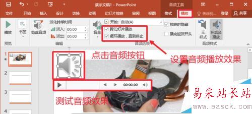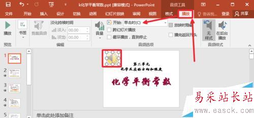 5、點擊插入的音樂圖標,然后選擇音頻工具中的播放選項,這里可以設置是點擊鼠標開始播放音樂,還是播放幻燈片自動播放音樂。大家仔細查看這里設置。