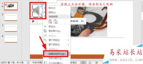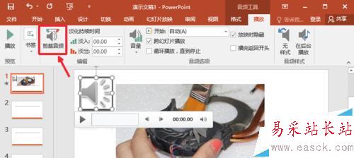 9、這個功能是比較實用的,比如我們電腦沒有音頻裁剪軟件,但是我們想要對MP3或者WAV歌曲進行下裁剪,可以在PPT中裁剪后,然后點擊裁剪后的音頻,保存到自己電腦,當然PPT中添加音樂后設置方法還是很多的,大家慢慢了解。