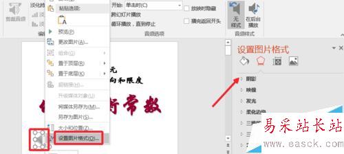 4、為了讓插入的音頻圖標好看些,我們可以在上面點擊右鍵,設置圖片格式,根據自己需要進行一些設置,對喇叭圖標設置比較簡單,這里就不介紹了。