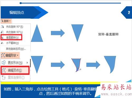 2、編輯頂點。如圖,插入三角形,點擊繪圖工具(格式)-旋轉-垂直翻轉,編輯形狀-編輯頂點,然后通過如圖的手柄來調節。
