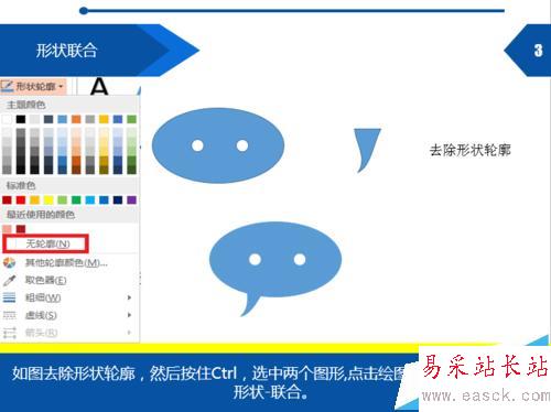 3、形狀聯合。如圖去除形狀輪廓,然后按住Ctrl,選中兩個圖形,點擊繪圖工具(格式)-合并形狀-聯合。