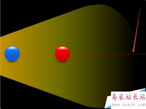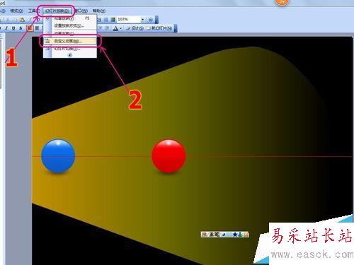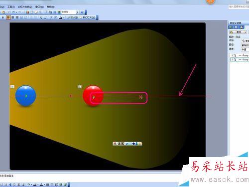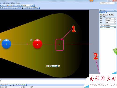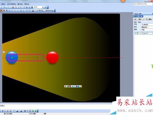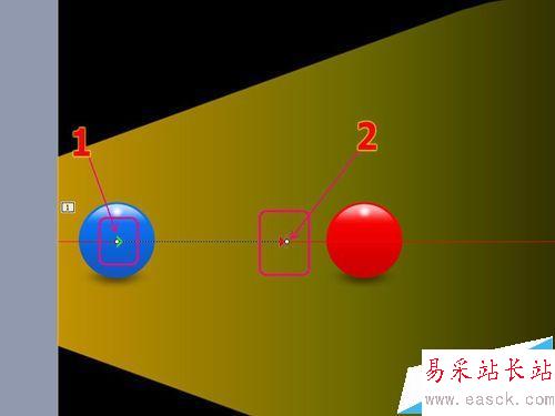 1、新建一個PPT文檔。在文檔中放置兩個小球,設置必要的背景效果等等。