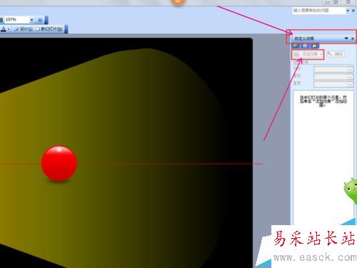 首先選中紅球,添加動畫,然后調整到參考直線,再調整路徑的長度。因為模擬的是光滑水平面,可以適當把紅球的動作路徑加長,使效果更加明顯。