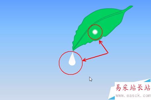 3、緊接著在葉片上面插入形狀正圓,并將正圓填充顏色為白色,添加形狀效果“柔滑邊緣”,設置為5磅,將正圓放在葉子上面靠近脈絡的位置,然后插入形狀“淚滴形狀”,填充白色,適當調整其大小,放在葉尖位置,如圖所示