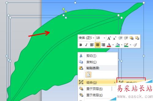 2、接著在頁面中繪制一個綠色的葉子出來,我們可以從網上找一張葉子的圖片,然后使用曲線延邊逐漸描摹出來,并且填充綠色,如果添加了葉子上面的脈絡,一定要將這些部分和葉子的整體形狀組合成一個整體