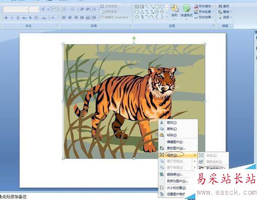 2、假如這里只需要保留老虎,那我們怎么辦?把組合取消了,注意剪貼畫是矢量圖。選中圖片,單擊鼠標右鍵,彈出右鍵菜單,選擇【組合】/【取消組合】如圖: