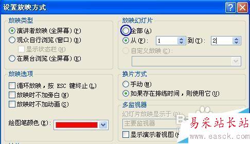 3、上圖中,在“放映幻燈片”那里,如果您的演示文稿選擇了從多少播放到多少張,那么,肯定就不會播放所有的幻燈片了。我們應該選擇上面的那個“全部”,選中其前面的控件打上一個點,這樣,問題就解決了。