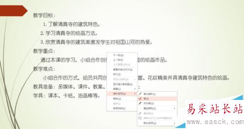 4、右擊這張幻燈片,選擇“指針選項”里面的“筆”,或者其他選項