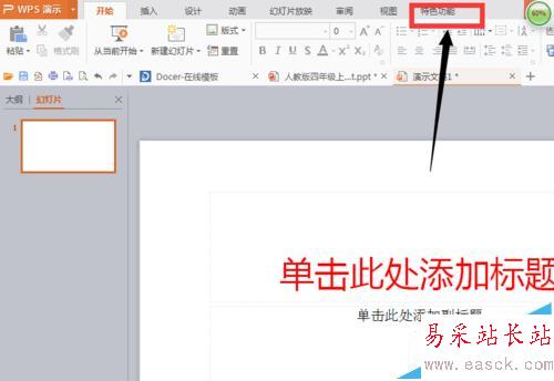 2、在打開的ppt上方尋找“特色功能”并單擊