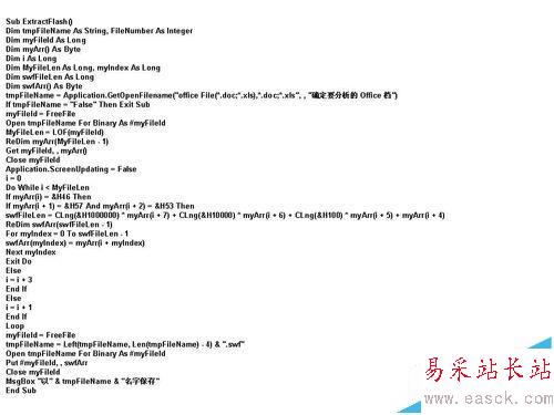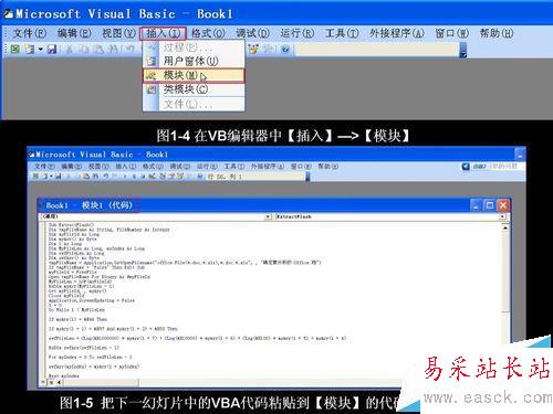 (2)新建excel文檔,打開該文檔,找到:【工具】—>【宏】—>【VB編輯器】,在VB編輯器中【插入】—>【模塊】 在彈出窗口中粘貼VBA代碼(見后面)。退出VBA編輯器。另存為“提取swf.xls”,見圖1-3至圖1-6。