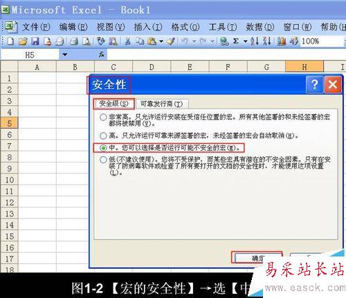 宏的安全等級(jí)設(shè)置方法:【工具】→【宏】→【宏的安全性】→選【中】見圖1-1和圖1-2
