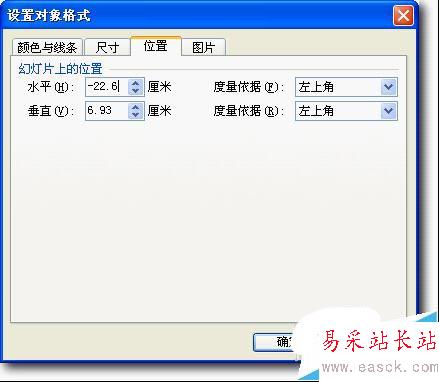 5、每張圖片寬度為4cm,12張寬度為48cm,因此第一張鼠的圖片位置水平為25.4cm-48cm=-22.6cm。 雙擊第一張鼠的圖片,進(jìn)入“設(shè)置對(duì)象格式”對(duì)話框,單擊“位置”標(biāo)簽,設(shè)置水平為-22.6厘米,如圖所示,單擊“確定”按鈕完成設(shè)置。