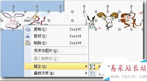 9、右擊選中的十二張圖片,選擇快捷菜單中“組合”子菜單中的“組合”命令,把十二張圖片組合成一個(gè)整體。