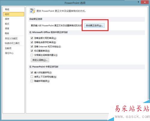 2、在“Powerpoint選項”對話框,點擊“自動更正選項(A)...”按鈕。