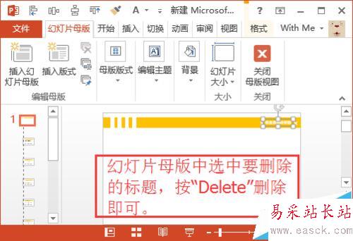 3、在母版視圖中,點擊左側導航的頁面,找到需要刪除的“文本/形狀/圖形”后,依舊點擊鼠標左鍵,選中后,按鍵盤“Delete”刪除即可。