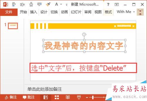 用鼠標左鍵單擊文字,點擊后,會在文字的四軸出現很多整齊的白色的方點,此狀態說明太“文本/形狀/圖形”被選中。選中后,直接按鍵盤“Delete”鍵,即可刪除該文字。