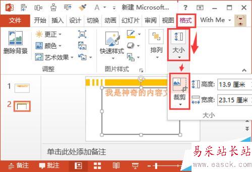 此方法具有局限性。用鼠標左鍵單擊選中要去掉標題的圖片,在頂部菜單欄中會多出一個“格式”的選項,點擊后找到“大小”欄目中的“裁剪”。