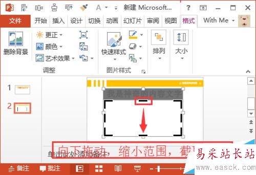 6、此時圖片四周出現黑色的邊框線,將鼠標移向黑色的粗線,點擊鼠標不放,向其中某個方向(比如向下)拖動,即可將文字去除。