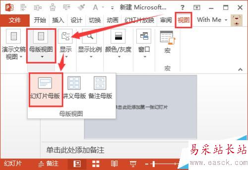 鼠標左鍵單擊“文本/形狀/圖形”后,沒有出現向步驟1中的“選中狀態”,出現此類問題原因較多,以母版為例,點擊菜單上的“視圖”,并找到“母版視圖”中的“幻燈片母版”。