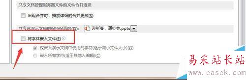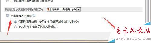 6、現(xiàn)在左邊的選項(xiàng)卡中找到“保存”選項(xiàng),在右邊出來(lái)的窗口往下拉,如下圖紅色框中所示,選中“將字體嵌入文件”命令。這樣,你在這個(gè)ppt中用到的字體就和你的ppt文件一同保存下來(lái)了。