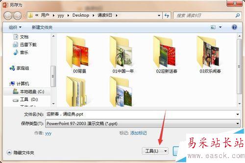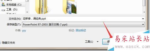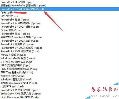 4、點(diǎn)擊如圖所示的下拉箭頭,看到有很多的格式可供選擇。我們需要的是選擇低版本的ppt文件格式,目前通用的是ppt2003版本的,選擇第三個(gè),如下圖箭頭所指的格式。