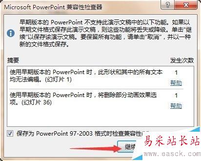 7、最后點(diǎn)擊保存按鈕,確定保存的文件。因?yàn)槲覀兪且4娴降桶姹镜膒pt中,所以會(huì)出現(xiàn)下圖2中的對(duì)話框,有些效果可以保存下來(lái),但是不能再更改了。點(diǎn)擊“繼續(xù)”就可以了。