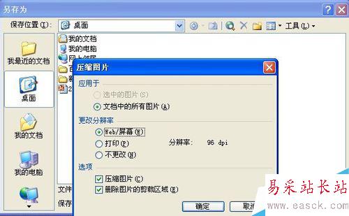 第三:在壓縮圖片菜單內,選中web/屏幕(W)選行,選擇內把壓縮圖片及刪除圖片的剪裁區域也都勾選上,然后確定。如下圖
