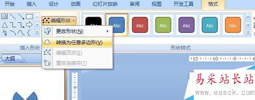 第二步:點擊標題欄的“繪圖工具”-“格式”-“編輯形狀”-“轉換為任意多邊形”