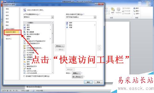 4、在打開的PowerPoint選項窗口中,點擊左側的“快速訪問工具欄”。