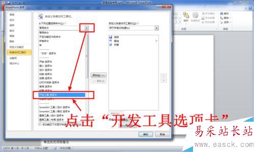 5、在快速訪問工具欄選項卡里,點擊下拉箭頭,從列表中選擇“開發工具選項卡”。