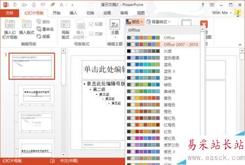 4、選擇后,在“幻燈片母版”選項卡下,找到“背景”欄目中,點擊“顏色”按鈕旁邊的下拉黑色小三角,在彈出下拉菜單中,選中“Office 2007-2010”,做為當前PPT的主題顏色。