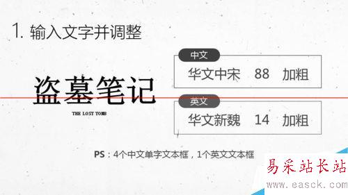 1、輸入文字并調(diào)整。輸入中英文:盜、墓、筆、記、THE LOST TOMB五個文本框。中文用華文中宋→字號88→加粗。英文用華文新魏→字號14→加粗。