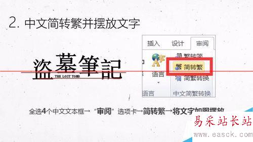 2、中文簡轉(zhuǎn)繁。全選中文文本框→審閱選項卡→簡轉(zhuǎn)繁→將文字如圖擺放。